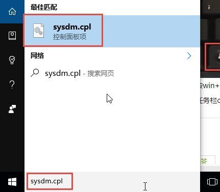 4、任务栏cortana搜索框中输入sysdm.cpl,最佳匹配中点击sysdm.cpl控制面板项打开。