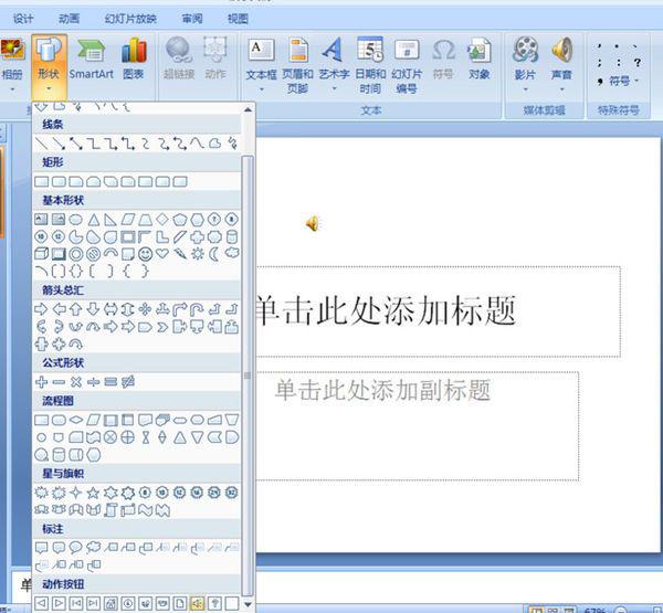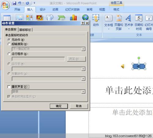接着再点插入——形状,往下拉找到动作按钮,选那个声音按钮,鼠标变成十字后按住左键拖出一个按钮图标。松手后会弹出动作设置,选无动作,把播放声音的勾去掉,其他别动,点确定。
