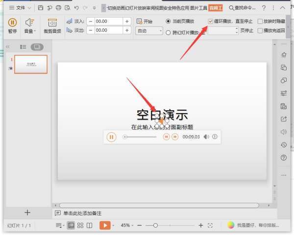 ??搞定!现在点幻灯片放映试试——音乐一开就贯穿全场,翻页也不中断,丝滑!
