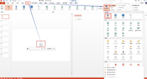 2?? 选中它→点「动画」选项卡→「添加动画」→选「播放」;