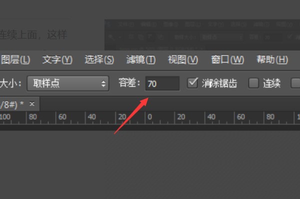 4、选择容差,后面的对勾放在连续上面,这样人物里面的白衬衫就不会选择上,多试几次容差值,将白色背景全部选中。