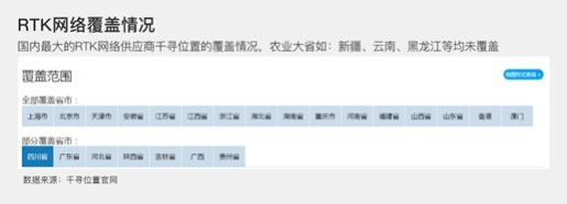 据目前国内最大的RTK网络供应商千寻公布的数据,截止2016年中,全国完成基站600多个。如果以单个基站有效信号覆盖半径10km计算,全国覆盖的区域仅达1.96%,其中,重要的农业大省,如:新疆、云南、黑龙江均无网络覆盖,而在广西、贵州等省份也只完成部分覆盖。