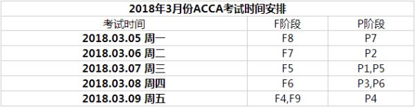2018年3月ACCA考试时间为3月5日-9日,具体每个科目考试时间安排如下:
