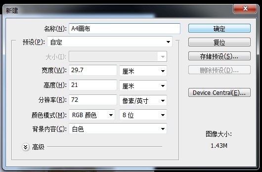 步骤2:在弹出的新建对话框中设置宽度为29.7厘米,高度为21厘米。如果用来制作印刷的、要求比较高的文件,设置分辨率为300像素/英寸;如果用来传阅浏览、电脑显示用,则设置分辨率为72像素/英寸。设置完成后,点击确定。