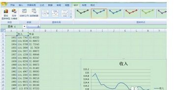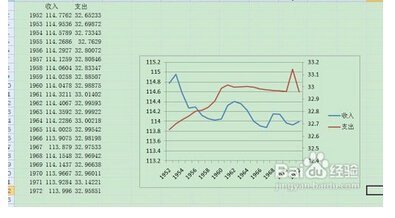 1.有表如下图,慎枣做出以年份为X轴,收入支出为左边和右边的Y轴,做出关于年份和收入的折线图,步骤如下图,结果如下图: