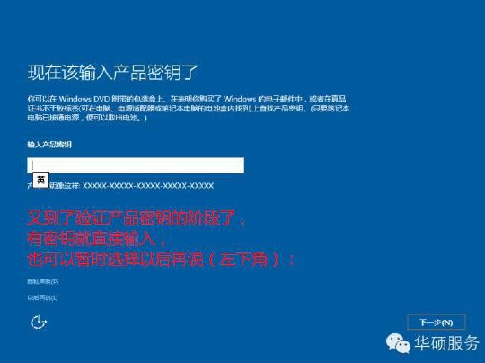 准备就绪后会重启,又到了验证产品秘钥的阶段,有秘钥可以直接输入,也可以暂时选择以后再说