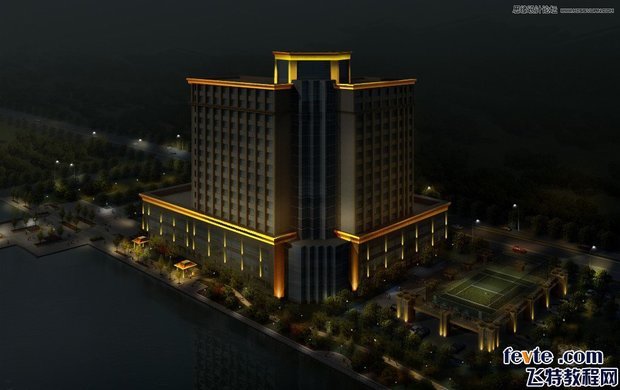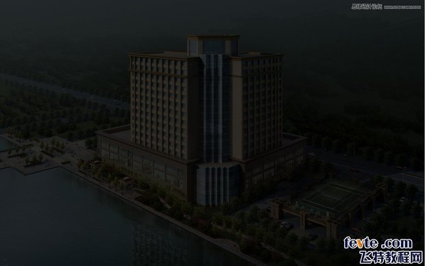 6、做出建员维看筑物及周围环境灯光在水中的倒影,调整画面的灯光亮度和对比度。