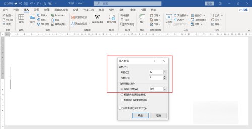 打开WORD文档,点击菜单栏上“插入-表格”,下拉选择插入表格,弹出窗口,输入12列5行。
