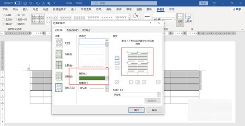 弹出窗口,修改线条的颜色为绿色,取消中间的竖线,四周的框线设置为绿色,修改中间的横线为虚线。