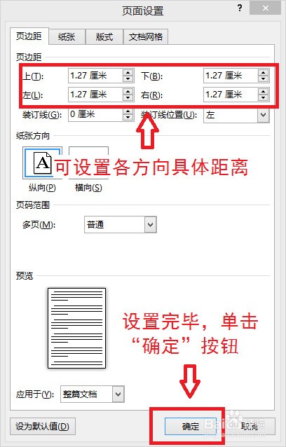 4、“页边距”里可以分别设置上、下、左、右的具体距离,设置好后单击“确定”按钮。