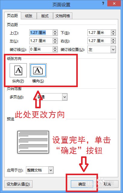 4、在“纸张方向”里,可以更改纸张的方向。设置完毕,单击“确定”按钮。
