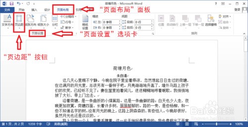1、在打开的文档中,找到“页面布局”面板的“页面设置”选项卡,单击里面的“页边距”按钮。