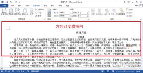 1、在打开的文档中,找到“页面布局”面板的“页面设置”选项卡,单击里面的“纸张方向”按钮。