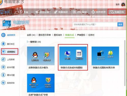 4.用腾讯电脑管家修复。打开电脑管家——电脑诊所——桌面图标