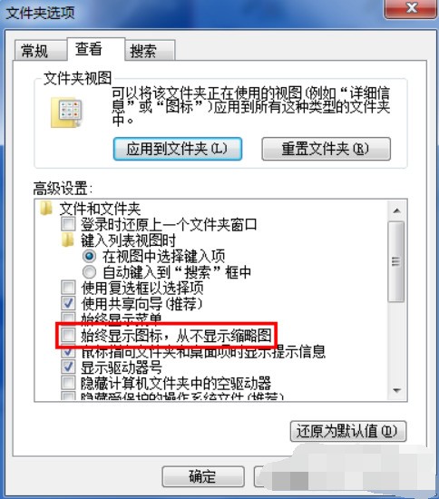 1、打开“文件夹选项”,选择“查看”标签,在“高级设置”中取消勾选“始终显示图标,从不显示缩略图”。