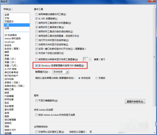 2、如果安装了Adobe Acrobat,打开“首选项”,在左侧的“种类”中选择“一般”,在右侧的基本工具中勾选“在Windows资源管理器中启用PDF缩略图”。
