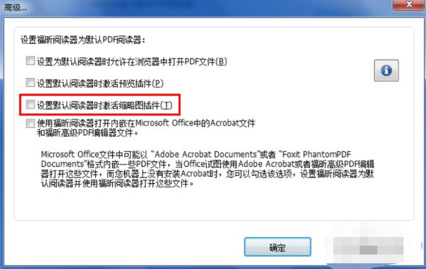 4、在“高级...”窗口中取消勾选“设置默认阅读器时激活缩略图插件”。这样就解决了PDF不显示缩略图的问题。