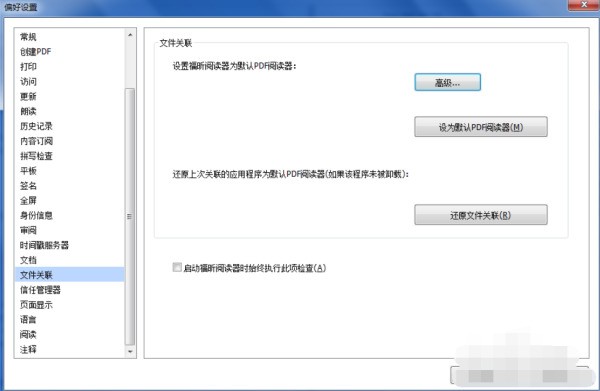 3、如果安装了Foxit Reader,打开“偏好设置”,在左侧选择“文件关联”,在右侧点击“高级...”按钮。