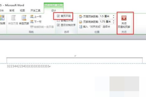 3、然后我们将首页不同给勾选上,之后点击关闭页眉和页脚;