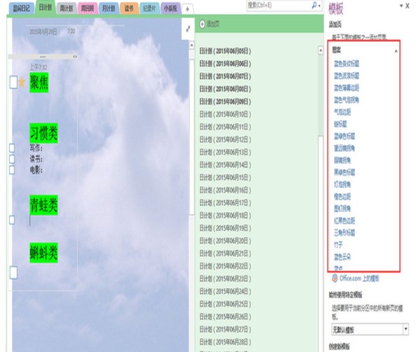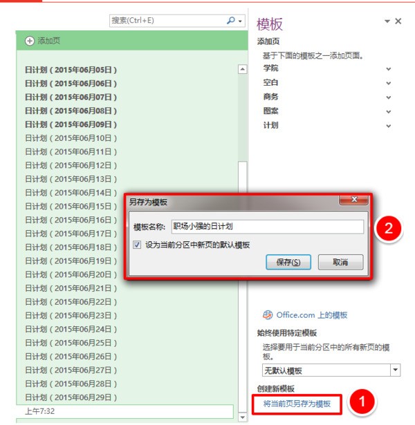 2.编辑好内容和格式后,我们同样也可以另存为自己的模板,点击右下角的“将当前页另存为模板”,并命名“模板名称”,勾选“设为当前分区中新页的默认模板”即可。以后写日计划时添加页面就是“职场小强的日计划”模板内容啦。同时,在模板库中也会新增“我的模板”这一项内容。