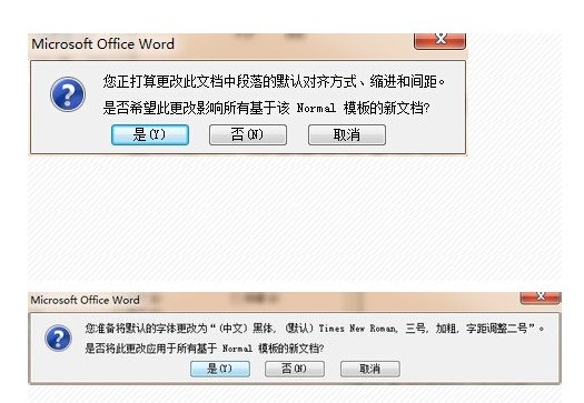 5.在全面进行模板设置后,需要保存,在操作中会出现对一些“默认的设置”如果所示,要选择“是”,“你准备将默认的字体更改为.....,是否将此更改应用于所有基于NORMAL模板的新文档?”