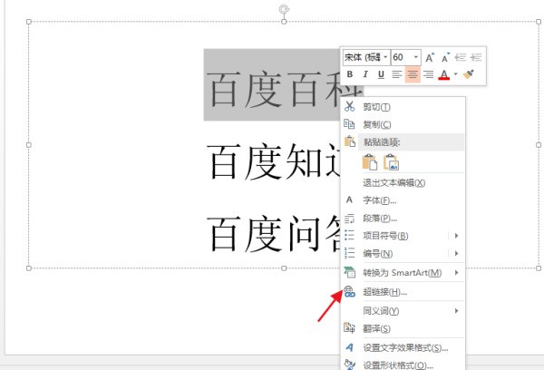 1、打开需要操作的PPT文件,然后选中大纲中的以一个大纲文字。右击鼠标,然后在弹出的窗口中点击超链接。
