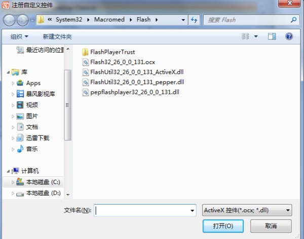 6、选择C:WINDOWSsystem32MacromedFlash目录下,U盘里复制过来的.ocx文件打开。