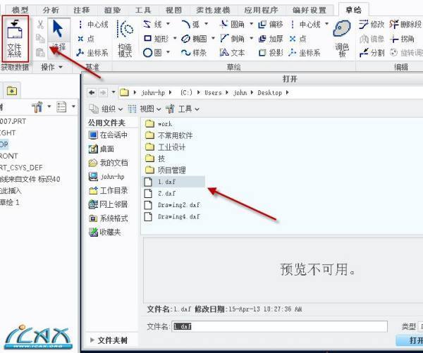 方法二:在草绘环境下,单击“文件系统”,然后选择需要导入的文件。相对方法一来说,此种方式的可调节性大些,在导入过程中,我们可以选择性的导入图档中的几何,还可以改变几何的旋转角度,比例等。