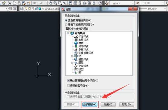 2、发现有不能复制粘贴片的图形时,输入图形清理快捷键PU(purge),按空格键,点击全部清理。