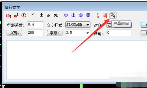 4、在“多行文字”操作界面,左键单击右上角的“屏幕选词”。