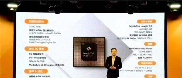 处理器:首发联发科天玑820芯片,采用7nm制程工艺,集成全球顶尖5G调制解调器,支持5G双载波聚合、5G+5G双卡双待、SA/NSA双模5G。