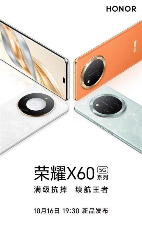 荣耀官方正式公布了X60系列的外观设计,新机将于10月16日发布,分为荣耀X60与荣耀X60 Pro两款。