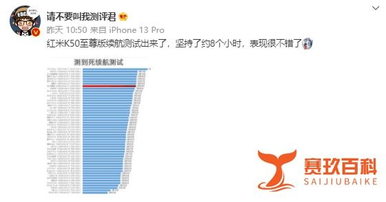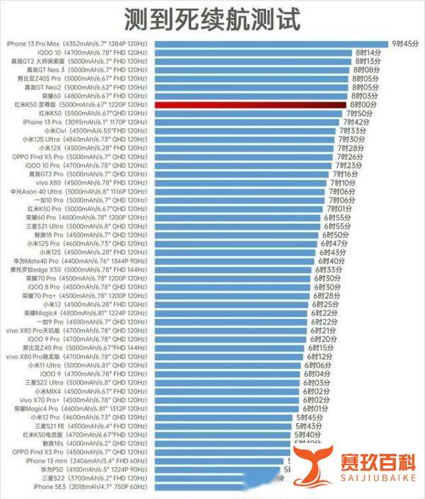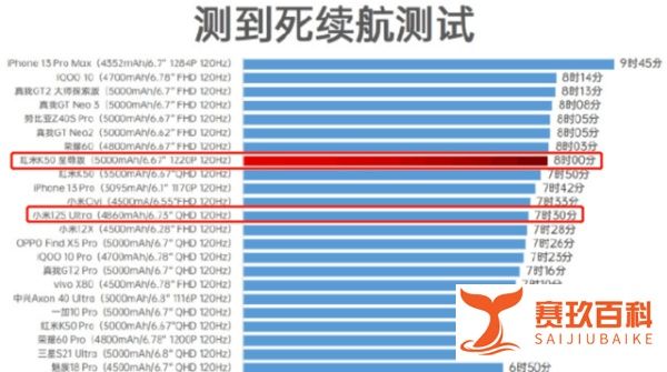 Redmi K50至尊版重度使用续航测试成绩为8小时,超越iPhone 13、Redmi K50及小米12S Ultra,官方标称续航达1.28天,综合表现优异。