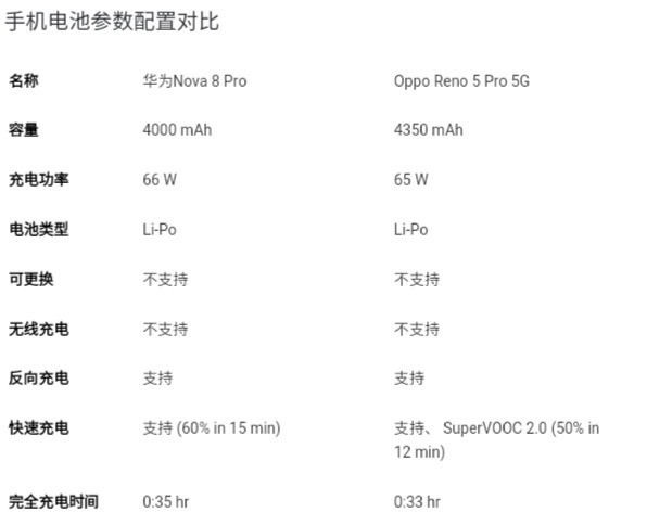 OPPO Reno5 Pro支持65W超闪充电,15分钟就可以充到66%,整个充电过程只需要32分钟,这个速度真的非常快!而华为nova 8 Pro支持66W华为超闪充电,15分钟能够充到58%,37分钟将电量完全充满,也是一个很不错的成绩。OPPO Reno5 Pro电池容量更大,因此在续航能力上是OPPO Reno5 Pro略胜一筹。