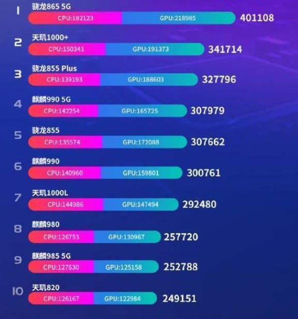 天玑1000+安兔兔跑分结果为341714分;geekbench5跑分为单核784,多核3043。而麒麟985安兔兔跑分结果为252788分;geekbench5跑分为单核683,多核2530。相比之下,明显是天玑1000+的跑分成绩更为优秀,而且它在安兔兔手机SoC性能榜上位居第二,麒麟985却只是排在第九名。
