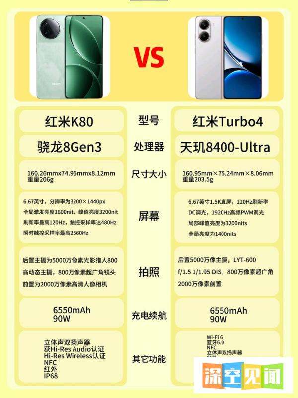 若预算充足,且对性能、屏幕显示、拍照和网络连接有较高要求,红米K80是更好的选择;若预算有限,更看重续航和防护能力,红米Turbo4能满足日常使用,是性价比之选。
