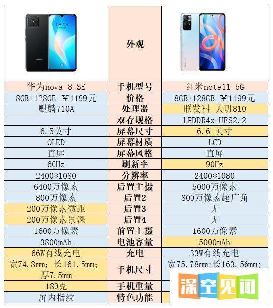 红米Note 11仅配备后置双摄,在镜头配置和功能丰富性上明显弱于华为nova 8 SE。