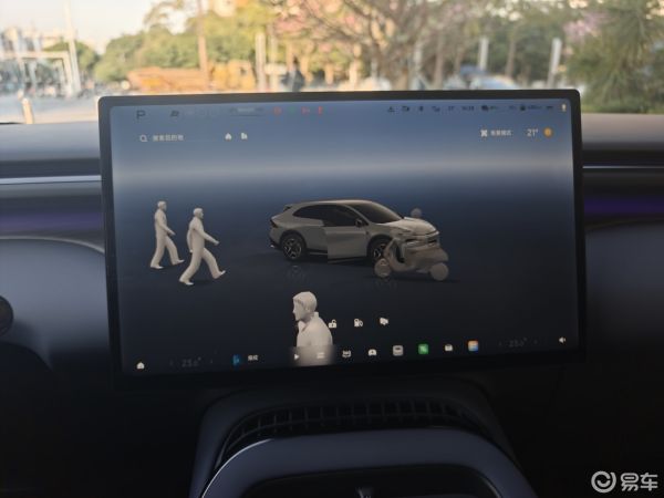 首先,天玑AIOS 6.0的主界面像是停车时的 SR (环境感知)状态在全屏呈现,旁边的车辆和行人都会被动态呈现,而不是之前仅仅模拟了车辆静止状态。但同时,你也可以放大缩小主页——放大车辆之后,就能够通过点击车辆的外部功能点来启动功能,比如开启尾门、打开充电口等等;而缩小界面后则是可以看到自动泊车等功能。