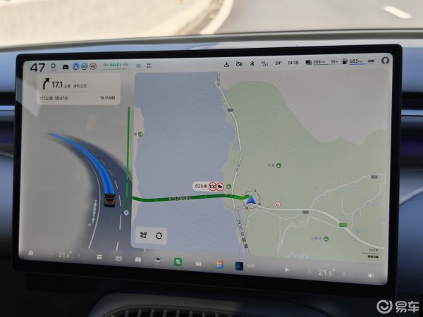 实际行驶中的逻辑是这样的:当你启动车辆并输入导航地址后,车辆开始行驶,这时系统就会直接进入车道级导航界面;之后当你开启智驾,车机主界面就会从车道级导航刷新成智驾辅助界面,但同时也会显示导航在右边的一个融合图像,提供一些基本信息。
