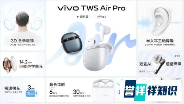 vivo TWS Air Pro真无线耳机:搭载14.2mm巨能声学单元,支持半入耳主动降噪、3D全景音频和蓝牙5.3,单次续航6小时,搭配充电盒可达30小时,售价299元,首销立减30元。