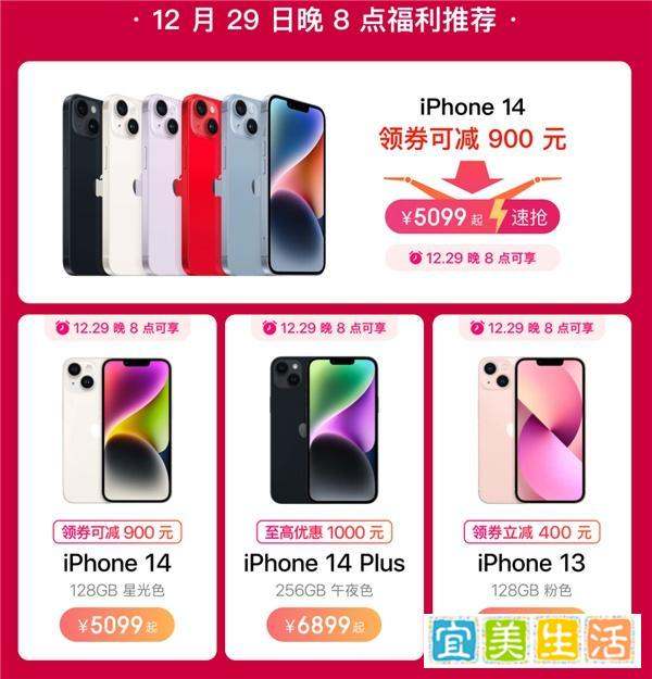 iPhone 14/14 PlusiPhone 14标准版运行内存升级至6G,GPU提升为5核心,影像加入新光像引擎及动作模式,低光源拍摄效果提升,续航能力也有所增强。iPhone 14 Plus则配备更大屏幕,适合偏好大屏的用户。年货节期间,iPhone 14最高优惠900元,iPhone 14 Plus优惠1000元,优惠力度显著。