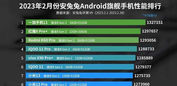 2023年2月安兔兔安卓旗舰手机性能排行榜中,一加11以1327151分蝉联第一,领先第二名红魔8 Pro+约2.95万分,较第十名vivo X90 Pro高出11.4%。 以下是具体信息与分析: