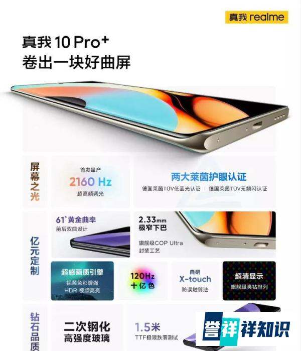 核心配置:真我10 Pro采用亿元定制曲屏,支持10亿色显示、120Hz高刷、61°黄金曲率、2160Hz高频调光及2.33mm极窄下巴;搭载天玑1080处理器,后置1亿像素主摄。