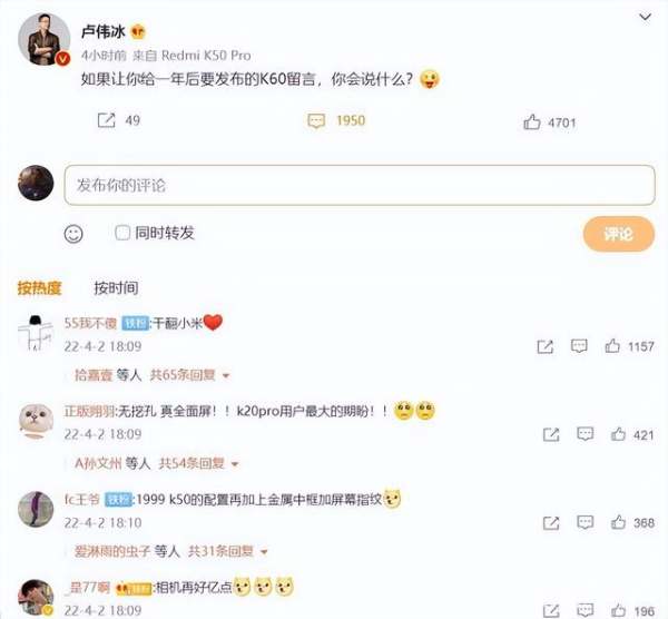 没想到红米K50系列手机刚刚发布,卢伟冰就开始为红米K60系列手机开始做起调研了。其实卢伟冰这么做无可厚非,完全是想借助着红米K50系列手机的市场热度提前为红米K60系列手机的发布做好一些诉求收集也是能够理解的,既然能够不花钱就能够收集到消费者的诉求,何乐而不为呢?