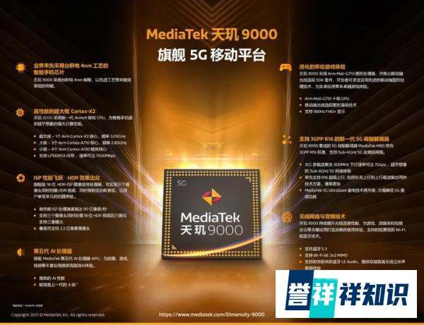 跑分突破百万:安兔兔跑分显示,天玑9000成为首款突破100万分的手机芯片,性能领先骁龙888约18%,多核性能与苹果A15持平。