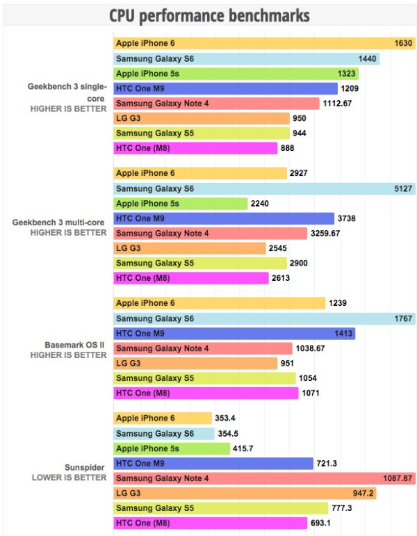 单线程CPU性能A8>骁龙810>Exynos 5430>麒麟920