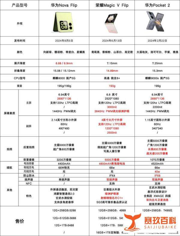 综合来看,荣耀Magic V Flip在功能实用性和性价比上更具优势,华为Nova Flip适合预算有限且对小外屏需求不高的用户,而华为Pocket 2则更适合追求旗舰定位和品牌价值的用户。 以下为详细对比分析: