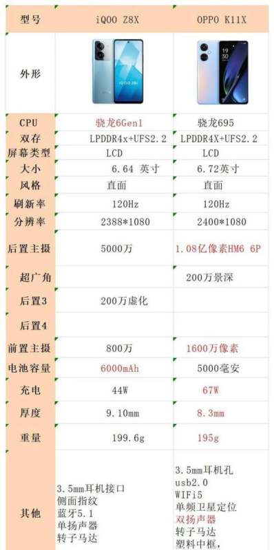以下是iQOOZ8x和OPPOK11X的主要参数对比图:
