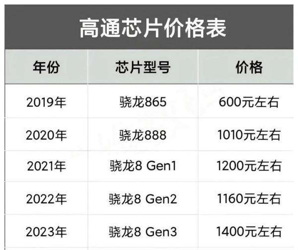 高通骁龙8系列芯片价格变化:2019年骁龙865售价约600元,2020年骁龙888因华为麒麟9000产能受限涨至1000元,2021年骁龙8 Gen1进一步涨至1200元,2023年骁龙8 Gen3达1400元,2024年骁龙8至尊版接近1800元,5年累计涨幅近1000元。