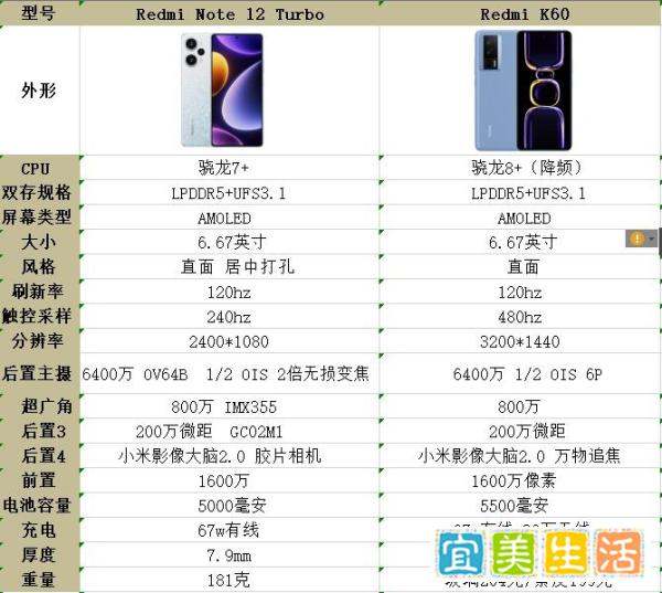红米K60的优势性能更强:搭载降频版骁龙8+处理器,安兔兔跑分超106万,相比红米note12turbo的骁龙7+(跑分约101万),在多任务处理、大型游戏等场景下表现更流畅。散热面积更大:散热面积达5000mm2,相比红米note12turbo的3725mm2,长时间高负载运行时温度控制更优,减少降频风险。屏幕素质更高:采用2K分辨率(3200×1440)屏幕,峰值亮度1400nit,支持480Hz触控采样率,相比红米note12turbo的1080P分辨率、1000nit亮度及240Hz采样率,显示更清晰、户外可视性更强、触控响应更灵敏。解锁方式更便捷:支持屏下指纹解锁,相比红米note12turbo的侧边指纹,解锁速度更快且操作更自然。续航与充电更全面:电池容量为5500mAh,比红米note12turbo多500mAh,续航时间更长;额外支持30W无线充电,充电场景更灵活。材质质感更优:后壳提供玻璃和素皮两种材质选择,相比红米note12turbo的塑料后壳,手感更高级且耐磨性更好。红米note12turbo的优势价格更低:以8+256版本为例,红米note12turbo售价1999元,比红米K60的2599元便宜600元,性价比更高。变焦拍摄更清晰:主摄支持2倍无损变焦,在变焦拍摄时细节保留更丰富,相比红米K60的数码变焦,成像质量更有优势。独立耳机孔更实用:配备3.5mm独立耳机孔,相比红米K60的Type-C二合一接口,可同时实现充电和听歌,无需额外购买转接头。手感更轻薄:重量仅181克,厚度7.9毫米,相比红米K60(204/199克+8.59/8.79毫米),轻23/18克、薄0.69/0.89毫米,长时间握持更舒适。